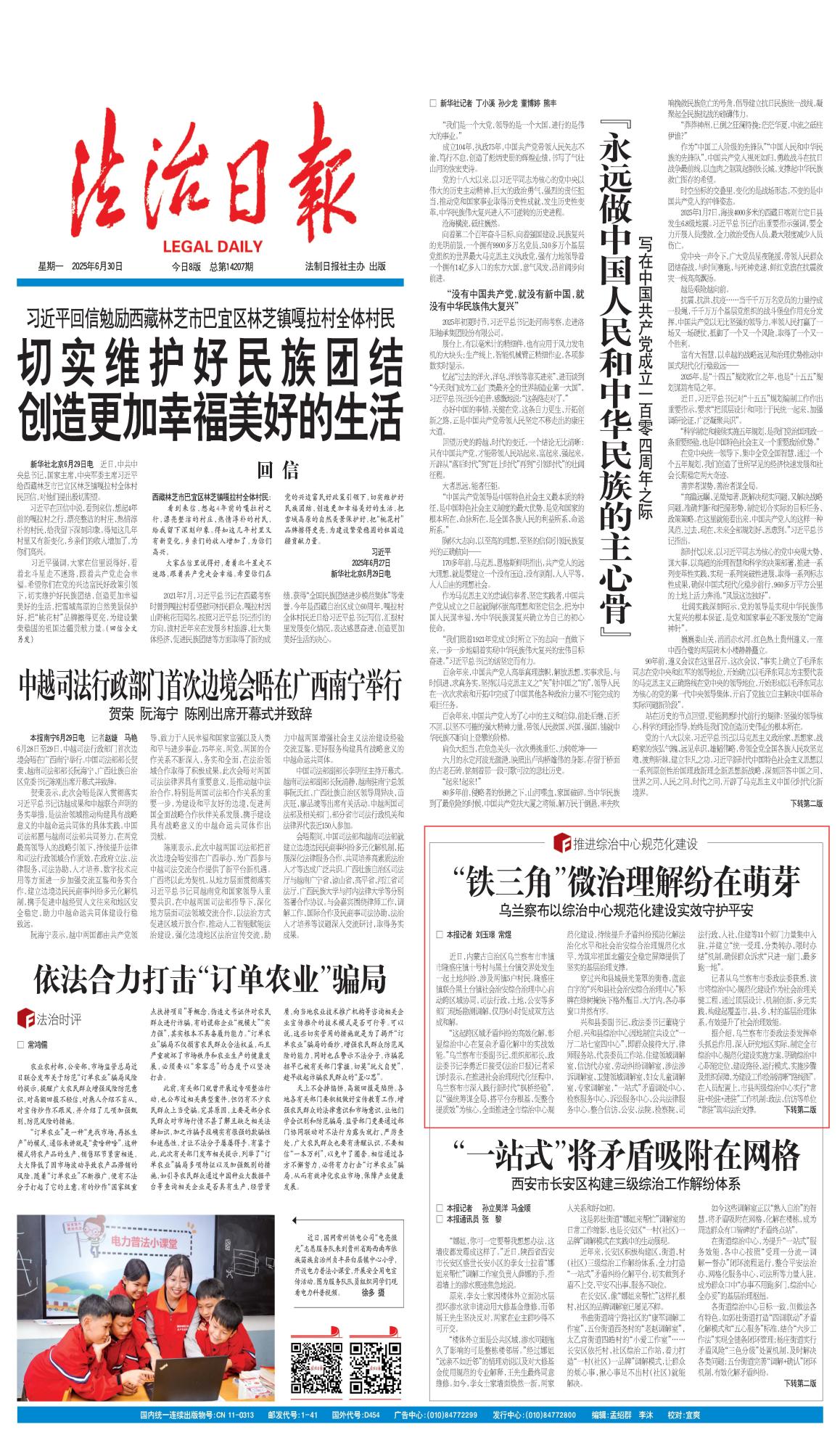 2025年6月30日《法治日报》第1版刊发了《“铁三角”微治理解纷在萌芽 乌兰察布以综治中心规范化建设实效守护平安》的文章,报道了内蒙古乌兰察布市通过综治中心规范化建设,构建起“党委领导、政府负责、社会协同、公众参与、法治保障”的社会治理新格局,以实实在在的成效守护一方平安稳定,为群众幸福生活保驾护航。