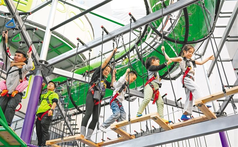 10月5日,家长陪伴孩子开心玩耍。当日,呼和浩特市大黑河军事主题公园人流如织,“逐光原野运动乐园”凭借寓教于乐的亲子游项目,吸引众多家庭前来游玩,日均接待游客近3000人,成为青城文旅活动矩阵中极具特色的亲子打卡地。草原云·内蒙古新闻网记者 王磊 摄